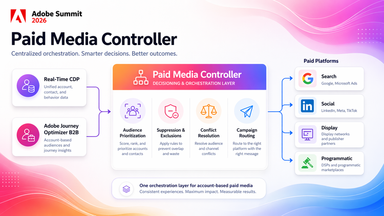 At Adobe Summit 2026, one of the more honest case-study sessions came from Adobe itself, walking through how the company rebuilt its own B2B paid media operation on top of Real-Time CDP and Adobe Journey Optimizer B2B Edition. The result is a centralized orchestration layer they call the Paid Media Controller. This is what it actually looks like, and why it matters for anyone running account-based programs at scale.
