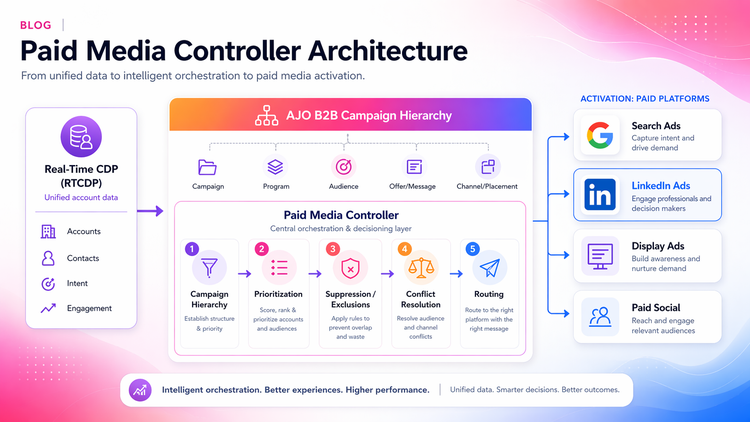 Adobe’s fix was to build a central orchestration layer — the Paid Media Controller — on top of two Experience Cloud foundations: Real-Time CDP for the account data and Adobe Journey Optimizer B2B Edition for the journey logic. The job of the controller is to decide, for every account, which paid campaign it should be in right now.