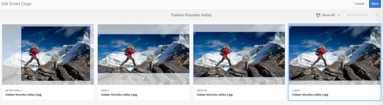 Dynamic Media – Image Smart Crop uses Adobe Sensei to automate bulk cropping by detecting the focal point and generating smart crops that preserve the “area of interest” across different aspect ratios and screen sizes. It can be applied to individual assets or entire folders, making it practical at the DAM scale.